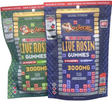NEW FROM DEVOUR… STACK ATTACK LIVE ROSIN GUMMIES FROM THE MAJOR STONED SERIES 300MG PER GUMMY. 2 FLAVORS IN 1