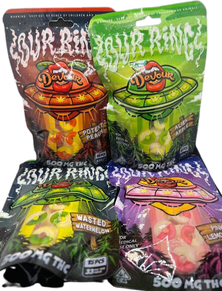 500mg- EVERYONE’S FAVORITE SOUR RINGS -15 PIECES 33mg EACH -AVAILABLE FLAVORS: *WASTED WATERMELON *PEACH *PINK LEMONADE *ALIEN APPLE