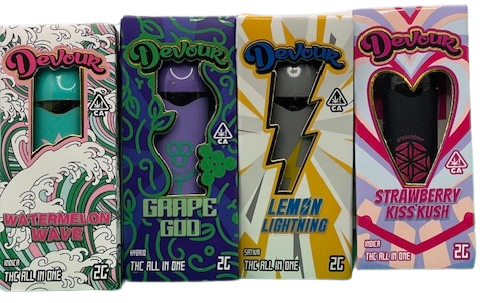 DEVOUR BELIEVES IN DOING IT BIG… NEW 2G PREMIUM DISTILLATE DISPOSABLE CARTS THC ALL IN ONE. CELEBRATE THE UNION OF CANNABIS & PLEASURE, AND FALL INTO DIVINE INTOXICATION THAT EXCEEDS HUMAN EXPERIENCE.